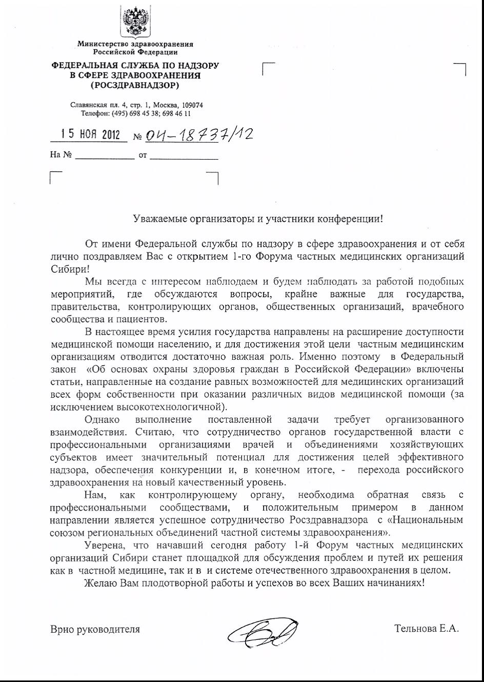 Обращение руководителя Росздравнадзора к участникам I Форума частных медицинских организаций Сибири