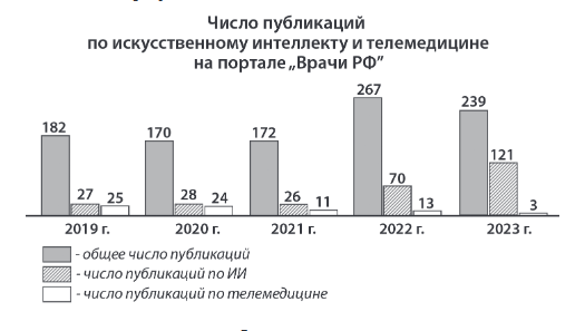 Не то плохо, что много публикаций по ИИ, а то, что они вытеснили все остальные. Для сравнения приведено сравнительно ничтожно малое число публикаций по телемедицине, которая еще совсем недавно была владычицей грез минздравовских чиновников. За 2 года – сокращение в 8 раз: с 26 публикаций в 2021 г. до 3 в 2023.
