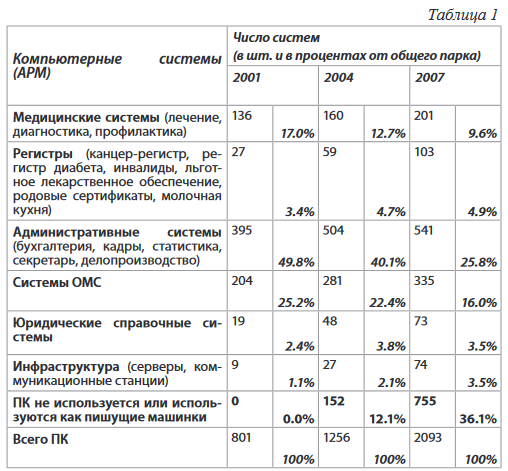 При этом «медицинские» АРМы распределены крайне неравномерно: в 53% ЛПУ нет ни одного медицинского АРМа, а в пяти ЛПУ (7%) сосредоточено 60% всего парка «медицинских»