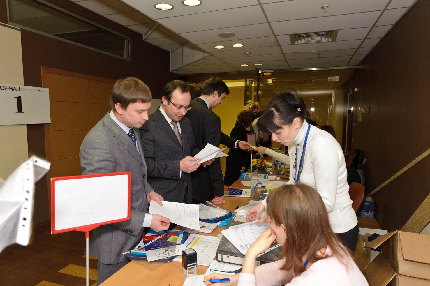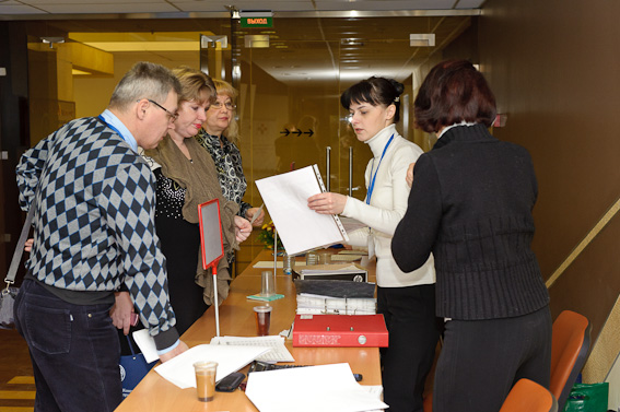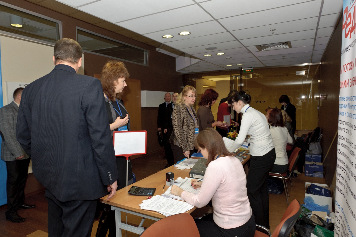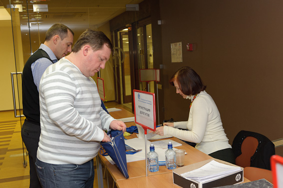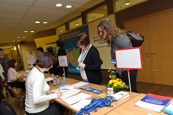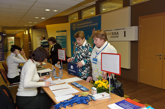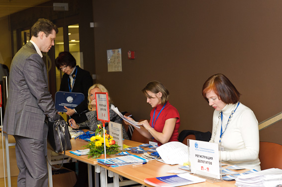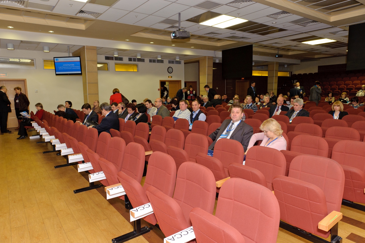 Первые участники конгресса заполняют зал и фотографируются