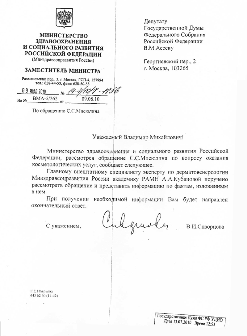 Ответ заместителя министра В.И. Скворцовой депутату ГД РФ В.М. Асееву на обращение С.С. Мисюлина