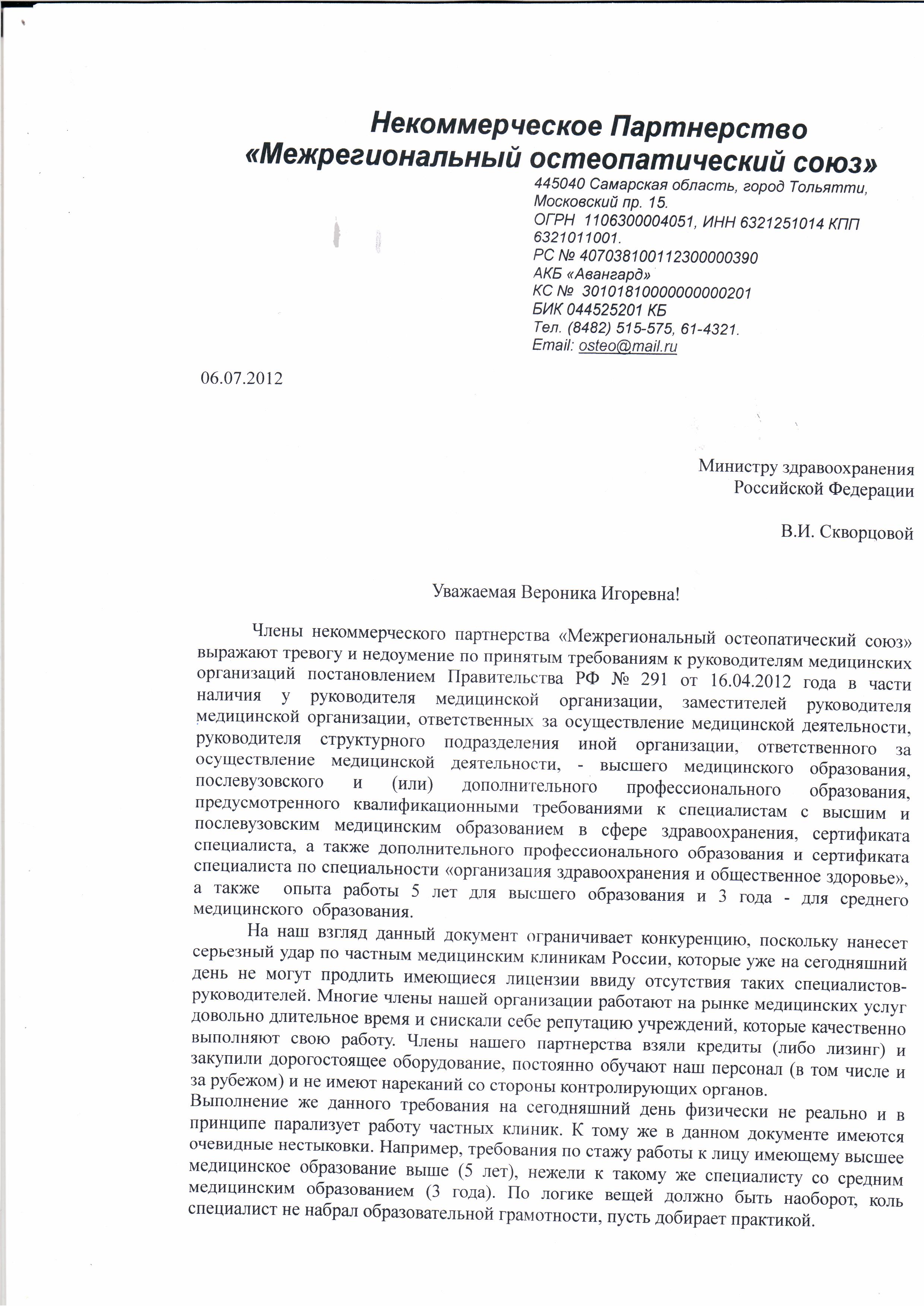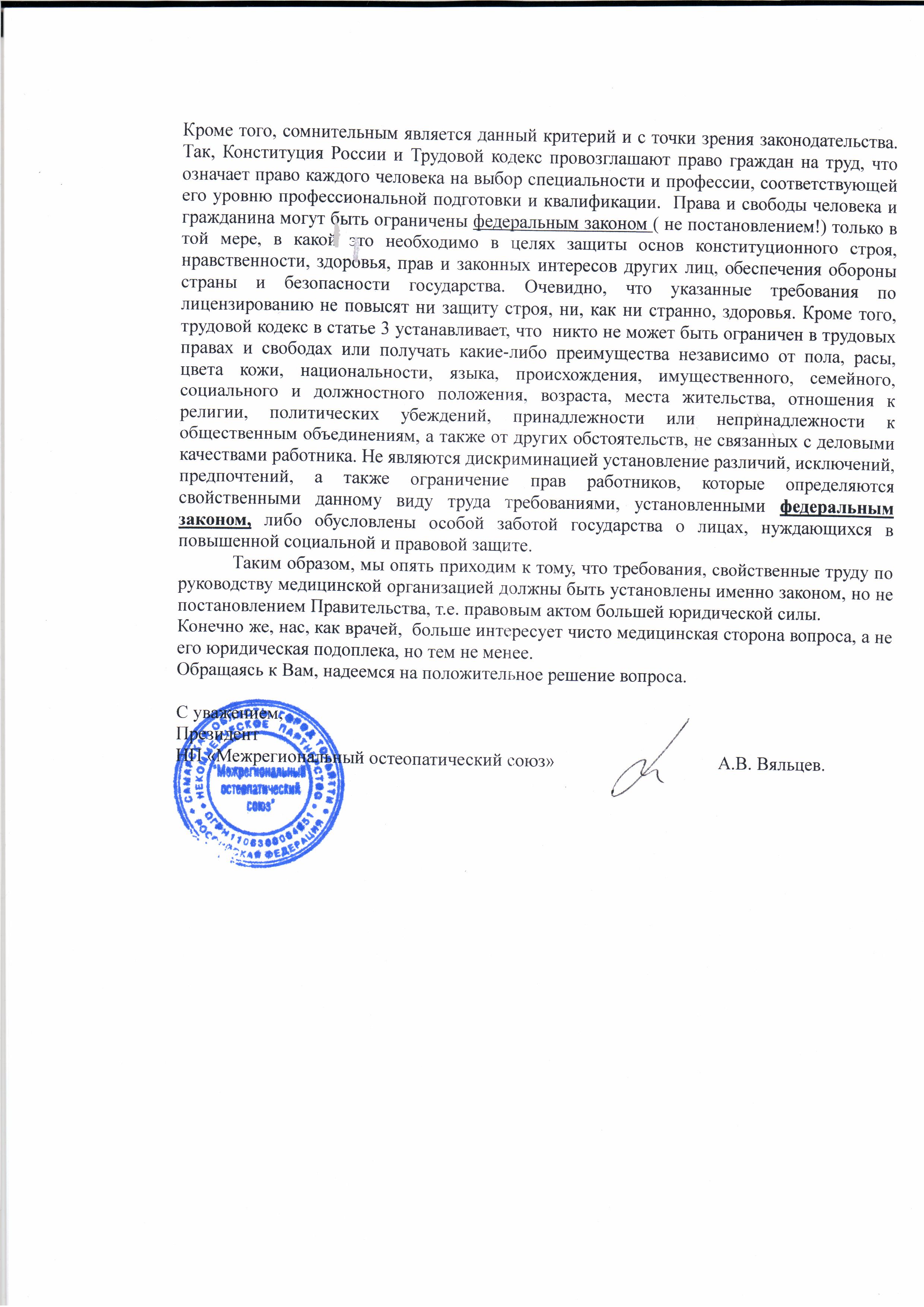 Письмо НП Межрегиональный остеопатический союз О лицензионных требованиях к руководителю