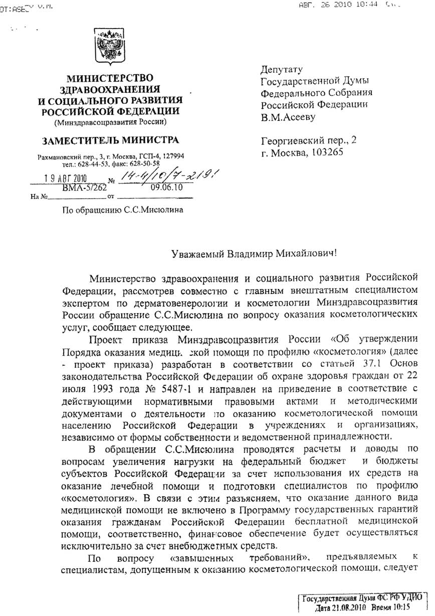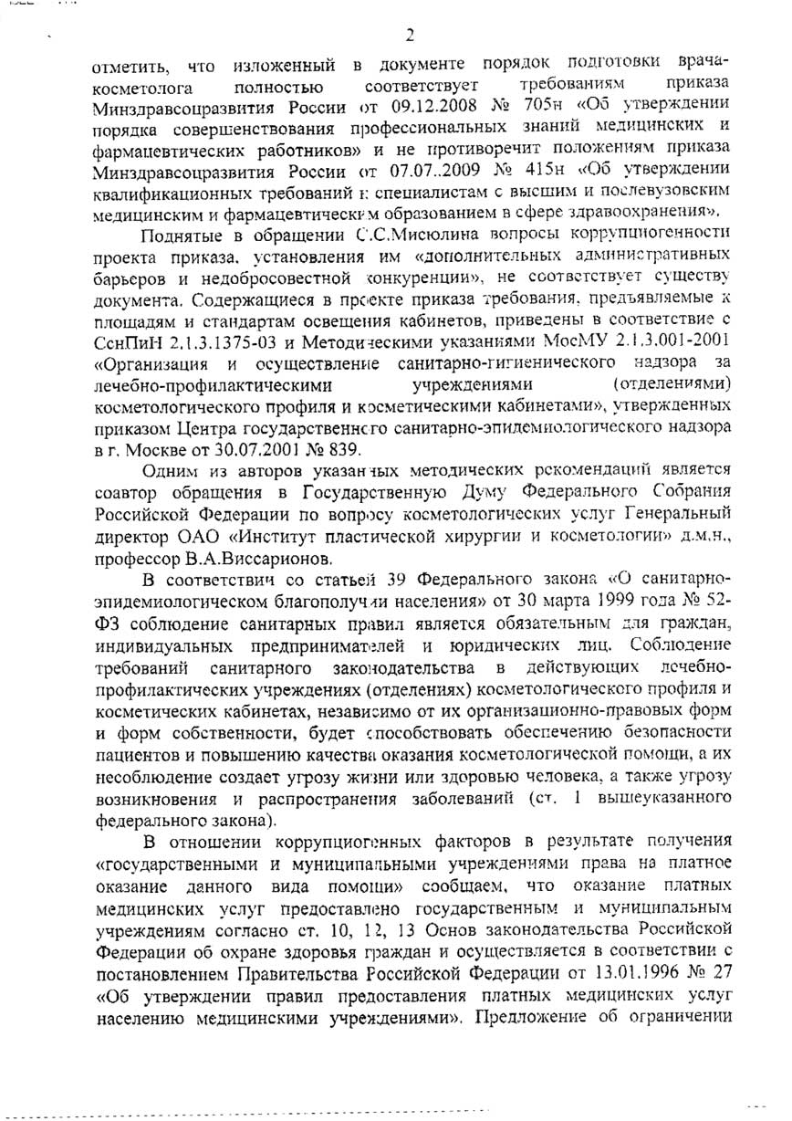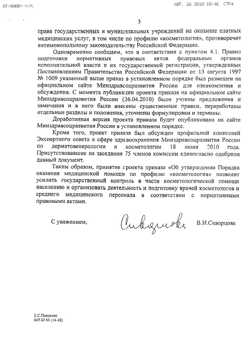 Ответ замминистра МЗ и СР РФ Вероники Скворцовой на обращение НП «Содействие объединению частных медицинских центров и клиник» по проекту приказа МЗ и СР РФ «Об утверждении Порядка оказания медицинской помощи по профилю «косметология»