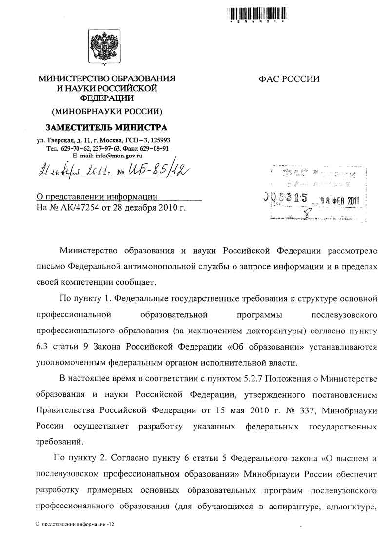 1. Письмо Минобрнауки ( №ИБ-85/12 от 21.01.2011г.) в ФАС России