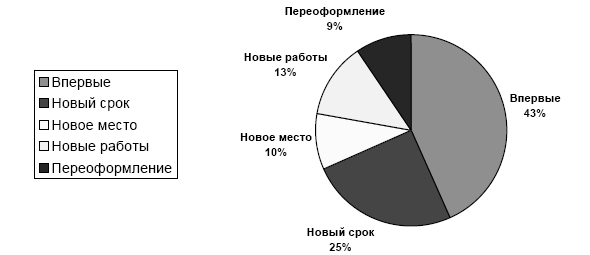 За период 2008 год 5 месяцев 2010 года в лицензирующие медицинскую деятельность органы субъектов Российской Федерации (далее лицензирующие органы) поступило 43 206 заявлений о предоставлении лицензии на осуществление медицинской деятельности, тогда как общее количество выданных лицензий на медицинскую деятельность составляет 39370 или 91%. 19 457 лицензий выдано впервые, что составляет 49,4% от общего количества выданных лицензий, 11 234 лицензии выданы на новый срок, 4 270 на новое место, а 5 753 на новый вид работ (услуг).