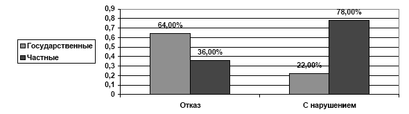 Из 385 нарушений при отказе в выдаче лицензии в 78% (301) случаев нарушения совершались лицензирующими органами в отношении частных организаций и индивидуальных предпринимателей. Фактически 1/3 (301 из 1070) отказов частным организациям и индивидуальным предпринимателям сопровождалась нарушениями со стороны лицензирующих органов. В отношении государственных и муниципальных учреждений нарушения составили 4% (84 из 1874).