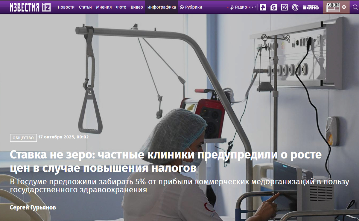 В октябре 2025 года в правительство РФ направлен законопроект, предлагающий отменить нулевую ставку налога на прибыль для частных медицинских организаций и установить вместо неё ставку в 5%.