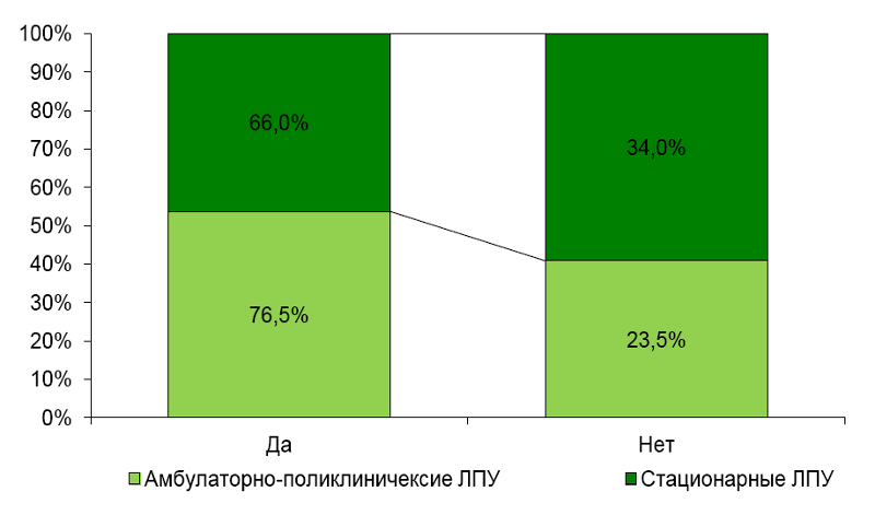 Распределение больничных учреждений во многом соответствует распределению населения по федеральным округам. В числе отличий - более низкая доля ЦФО в населении (27%) и более высокая позиция Южного федерального округа, где проживает 10% россиян, что ставит его на четвертое место (по числу больничных учреждений округ на шестой позиции).