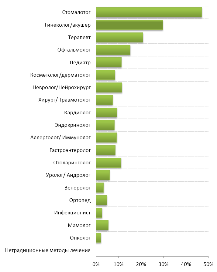 Рис. Медицинские специалисты, за платной консультацией или лечением которых обращались респонденты, 2013 г., %, в % от тех, кто пользовался платными медицинских услугами Источник: РБК.research (данные по России в целом)
