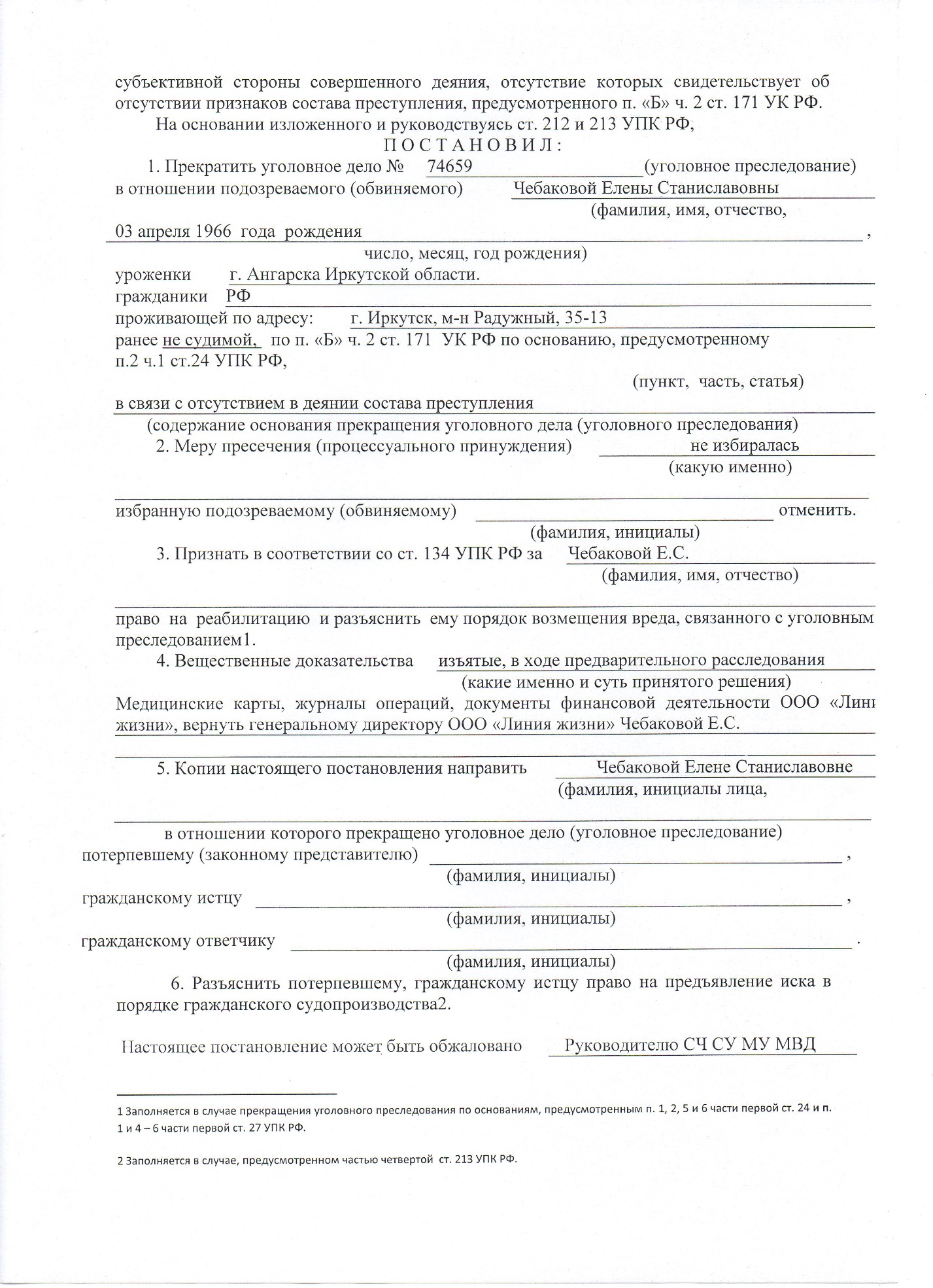 Уголовное дело №… было возбуждено 27.08.2015г. на основании рапорта оперуполномоченного … капитана полиции … , зарегистрированного … в … по п. «б» ч. 2 ст. 171 УК РФ * в отношении Чебаковой Елены Станиславовны (руководителя клиники) , о том, что Чебакова Е.С.. , являясь ген. директором ООО «Линия жизни», в период с 06.12.2012 по 01.07.2014, находясь по адресу: г. Иркутск, ул. Ширямова,2 осуществляла предпринимательскую деятельность без лицензии, с извлечении дохода в особо крупном размере в общей сумме ... млн. руб.