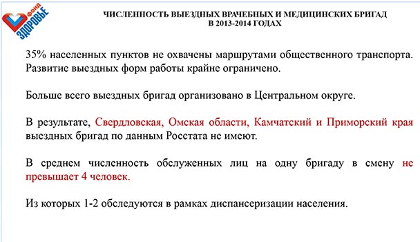 По итогам 2014 года 35% населенных пунктов в Российской Федерации не охвачены путями общественного транспорта. Развитие выездных форм работы крайне ограничено, в то время как по официальным отчетам количество выездных врачебных и медицинских бригад растет. Так, например, в Рязанской области количество врачебных бригад увеличилось с 3 в 2013 году до 39 в 2014, количество мобильных медицинских бригад, оснащенных транспортным средством и медицинским оборудованием, составляет 32. Однако при анализе распределения выездных бригад по регионам можно обнаружить, что, в основном, они сконцентрированы в центральных регионах с высокой плотностью населения, а субъекты, имеющие большую протяженность, где расстояние до регионального центра может измеряться несколькими сотнями километров, не имеют мобильных бригад. В их числе Мурманская, Свердловская, Омская области, Камчатский и Приморский края, еще ряд регионов. А там, где имеются врачебные и мобильные медицинские бригады, работают они далеко не всегда эффективно, обслуживая за смену один-два вызова.