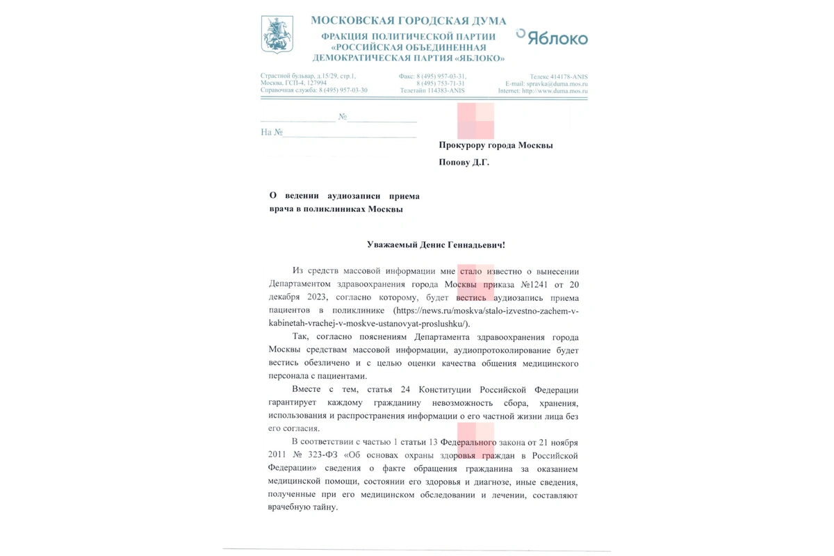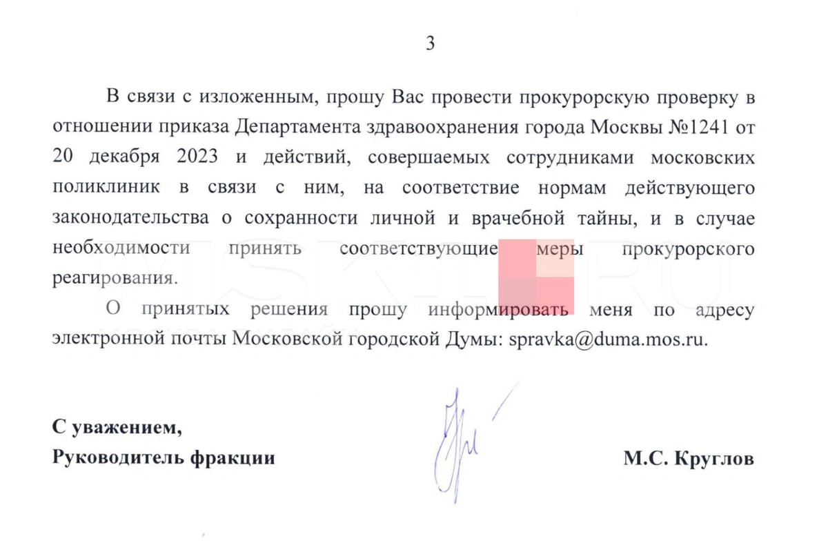 В пятницу, 12 января, депутат Мосгордумы Максим Круглов направил обращение в столичную прокуратуру с требованием проверить законность приказа депздрава о прослушка пациентов. По его словам, документ может нарушать закон о сохранности личной и врачебной тайны.