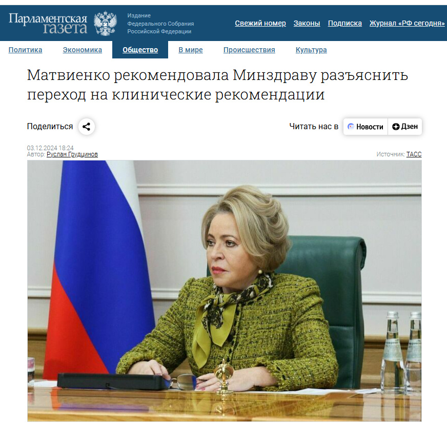 Вице-спикер Совфеда Инна Святенко также затронула эту тему. «Важно отметить, чтобы Правительство и Минздрав провели в декабре текущего года селектор о готовности регионов к реализации клинических рекомендаций», — сказала Святенко.