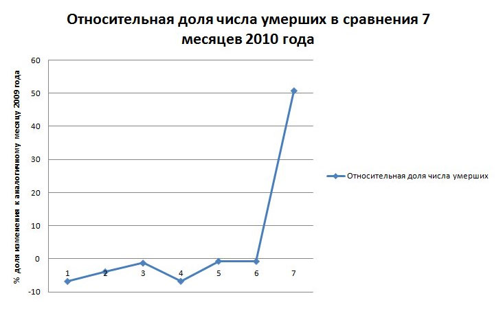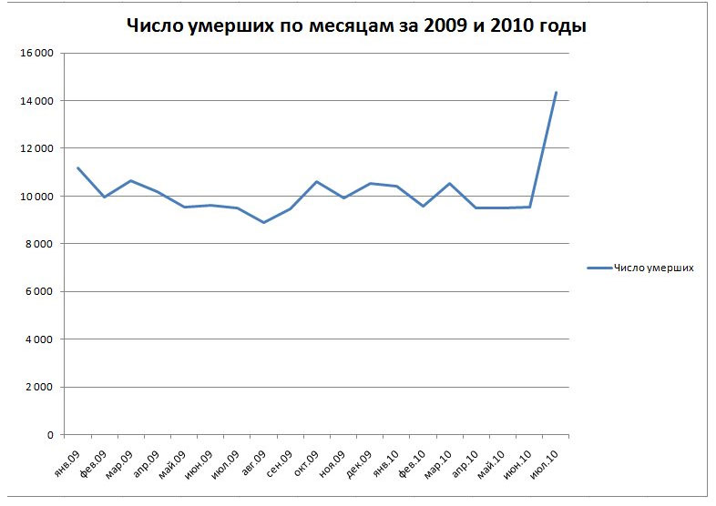 Вот так выглядят графики по изменения абсолютного числа смертей за последние 19 месяцев с января 2009 по июль 2010 включительно.